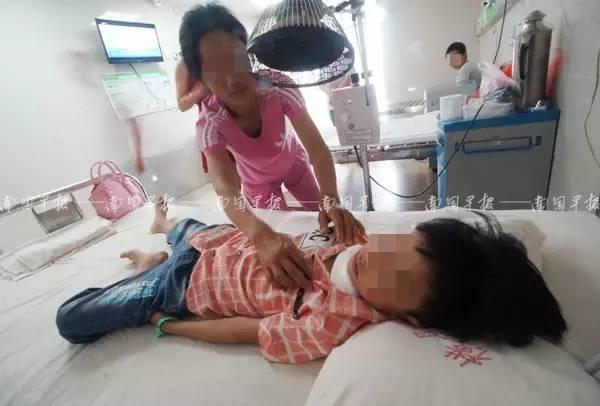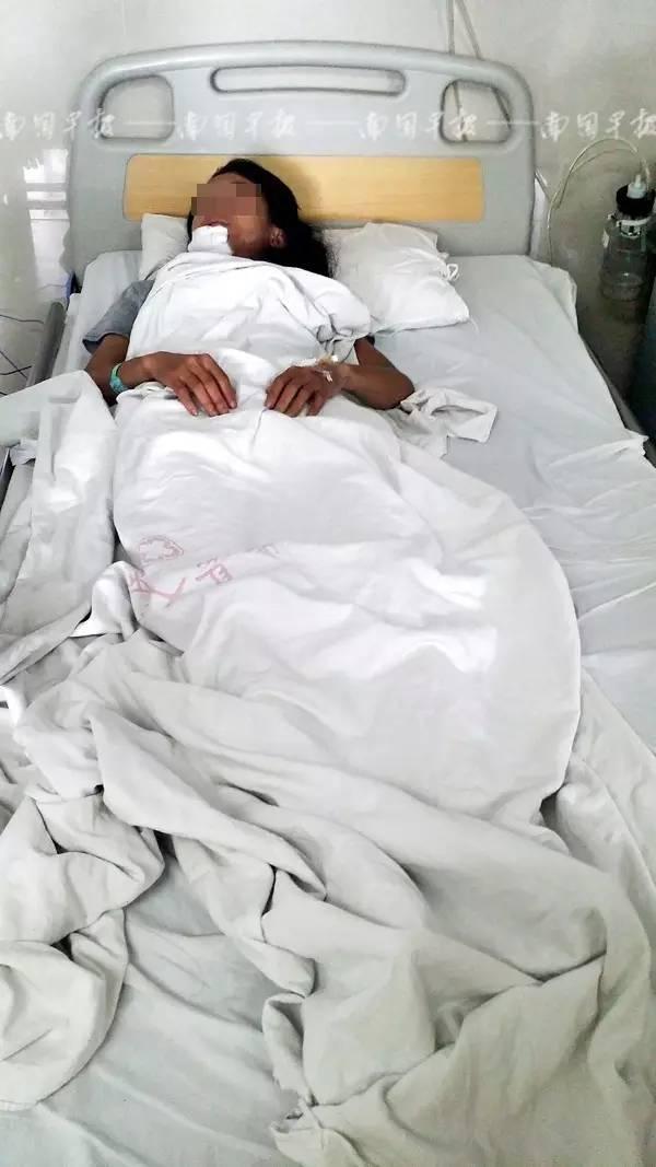 受害女子下巴被男子割伤,被解救后送往医院治疗。