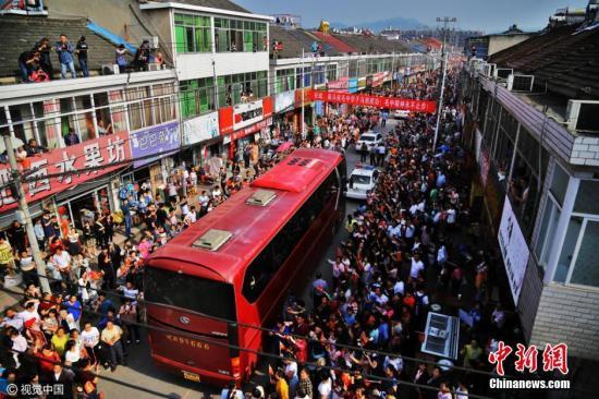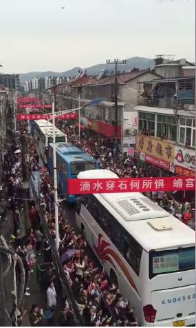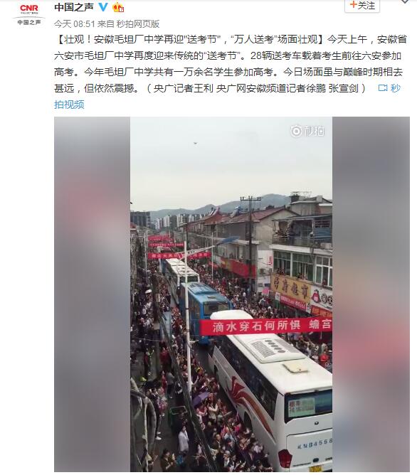 【壮观!安徽毛坦厂中学再迎"送考节",“万人送考”场面壮观】今天上午,安徽省六安市毛坦厂中学再度迎来传统的“送考节”。28辆送考车载着考生前往六安参加高考。今年毛坦厂中学共有一万余名学生参加高考。今日场面虽与巅峰时期相去甚远,但依然震撼。(央广记者王利 央广网安徽频道记者徐鹏 张宣剑)