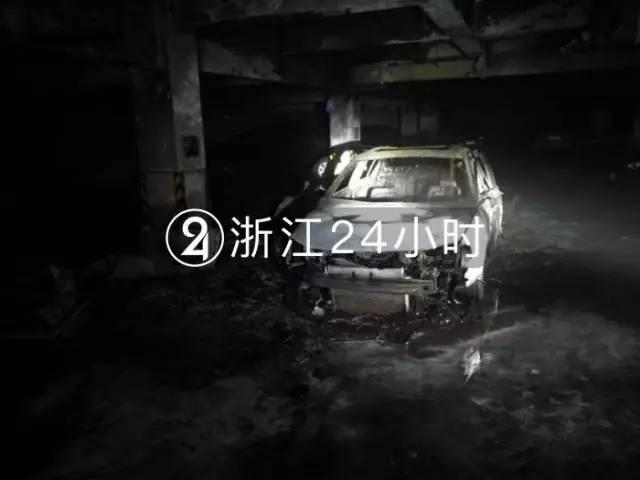 地下车库内满是积水,车辆已经被清空。在距离出入口约100米的通道中央,停着一辆白色的轿车,车身已经烧得面目全非,变成了一副铁架子,完全无法辨认车型。连四周的墙壁和天花板也被烤得漆黑。