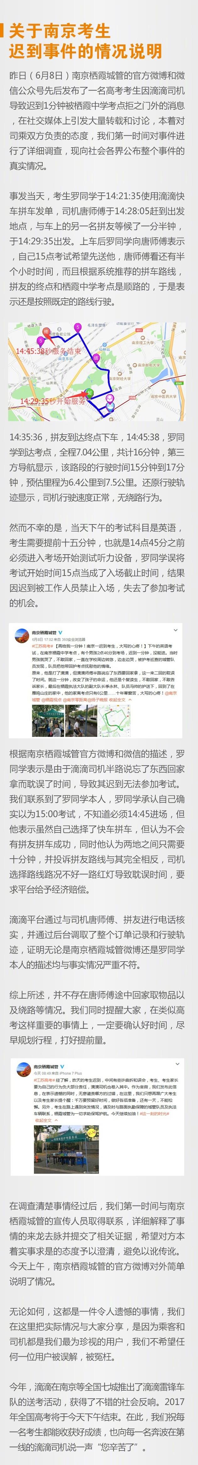昨日,南京一名高考考生使用滴滴快车拼车导致迟到1分钟被栖霞中学考点拒之门外,引发网友热议。滴滴官方今日指出,考生本人承认自己确实以为15:00考试,不知道必须14:45进场。但考生表示虽然选择拼车,但认为不会有拼友拼车成功。他还表示由于滴滴司机半路说忘了东西回家拿而耽误了时间。他还认为两地之间只需要10分钟,并投诉另一名乘客路线与其完全相反,司机选择路线路况不好一路红灯导致耽误时间,要求平台给予经济赔偿。