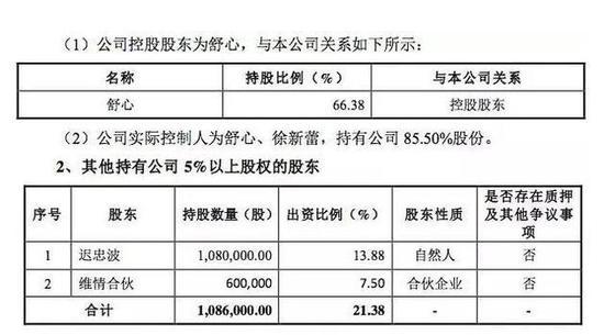 维情股份的《公开转让说明书》显示,维情公司成立于2009年,股份公司成立于2016年,目前注册资本为800万元。维情股份主要从事婚姻家庭咨询与服务的业务,法定代表人是舒心。公司的实际控制人为合计持股85.50%的舒心、徐新蕾夫妻二人,均为"60后"。舒心曾在上海宜川街道社区服务中心工作8年半之久,徐新蕾则毕业于心理咨询与治疗培训中心(海南)。