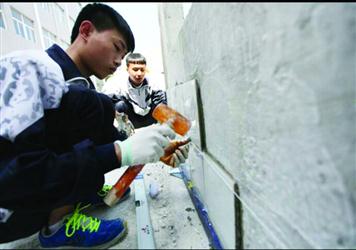 袁家齐话不多,瘦瘦的,只见他熟练地把抹上水泥的瓷砖贴在墙上,然后敲平,擦干净。一块瓷砖抹上水泥要好几斤,对臂力和体力都是极大考验。为了这次比赛,袁家齐已经很长一段时间没有回家了,每天住在学校练习。一直练得手端着饭碗都发抖。袁家齐的搭档陈冲负责制作轻钢龙骨,小伙子年纪不大,但心细手稳,做出来的龙骨非常漂亮。