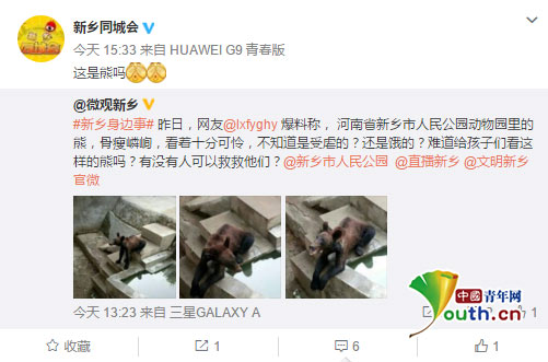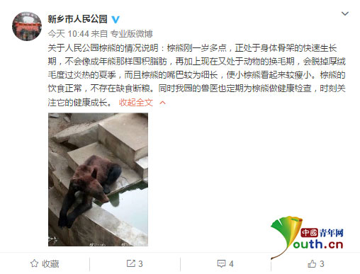 中国青年网北京6月19日电(记者 宋继祥)近日,有网友称河南省新乡市人民公园动物园里的熊骨瘦嶙峋,质疑动物园管理不善,并配有几张棕熊的照片。对此,新乡动物园6月19日通过微博发布情况说明称:棕熊年幼,不会囤积脂肪,又处于换毛期,所以看起来比较瘦小。