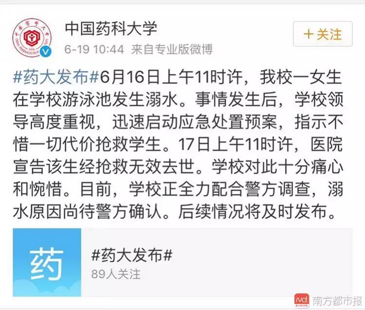 上周五(6月16日),中国药科大学一名大一女生在游泳课上溺水,后经抢救无效死亡。