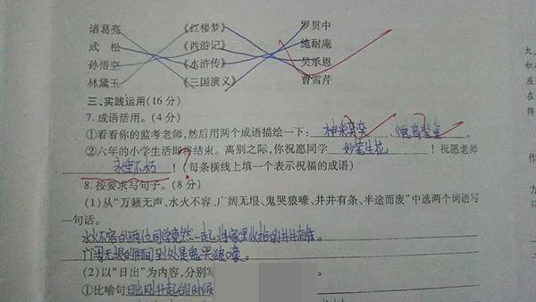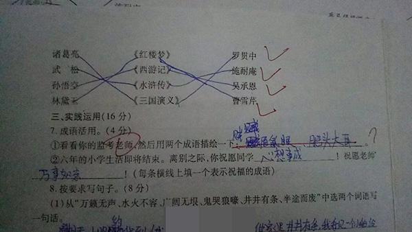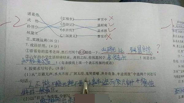 还有另一道语文题是这样:小学马上毕业了,离别之际,你祝愿老师()。括号里填一个祝福的成语。有的学生写的是“永垂不朽”。