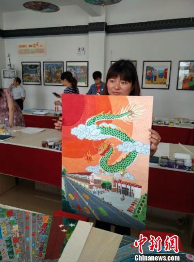 其实,40左右的葛春芳还算不上农民画画师,因为她是今年3月份才开始学农民画的。去年那场龙卷风发生之前,她和丈夫赶集市做小生意,龙卷风损毁了她家房屋,春节前一家住上安置房。3月份她和丈夫赶集的时候,到晨阳农民画创业街上的农民画画室,她想让丈夫学农民画,不料,丈夫画两下没有这方面的天赋,而她一试竟然得到在场画家的认可,她便专心在这里学起农民画来。