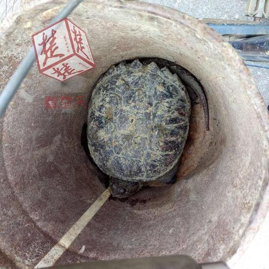 6月24日上午8时许,80岁的吴爹爹骑车来到黄陂区祁家湾派出所报警求助。吴爹爹介绍,他一早去菜地干活,发现菜地有一只大龟,他使用铁铲费了好大力气才将大龟放进了油漆桶。因担心是保护动物,特意送到派出所。