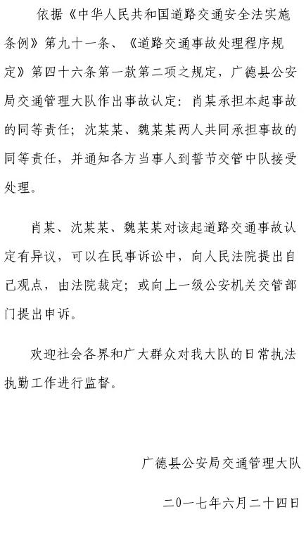 司机肖某承担本起事故同等责任,沈某某、魏某某共同承担事故同等责任,并通知各方当事人到誓节交管中队接受处理。双方如有异议,可以向法院提起民事诉讼或者向上一级公安机关交管部门提出申诉。