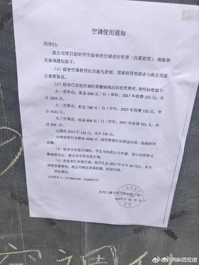 【南宁一高校统一安装空调 租赁价因人而异被吐槽】对于空调的使用,有的高校把费用算进了住宿费,有的则采用租赁的形式。这几天,广西财经学院相思湖校区的同学们就面临租空调的问题。让同学们心里不舒服的是,同款空调的租赁费标准竟然有着年级之分。大一是600元/年/台、大二是700元/年/台、大三是800元/年/台,同学们不禁吐槽,那我是大三学生,要交800元,怪我咯?