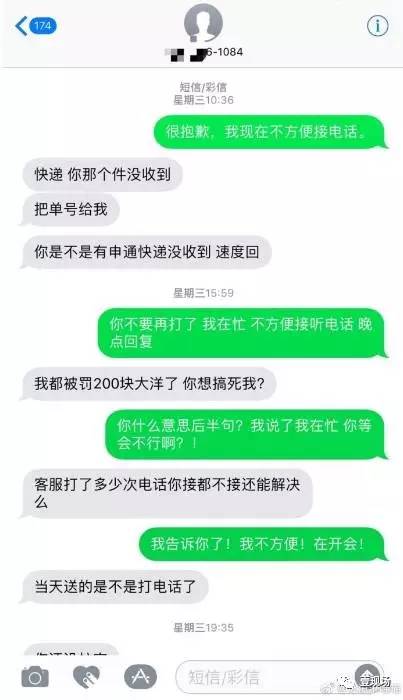 在发起物流投诉不久后,王女士开始收到该快递员的发来的充满愤怒的短信,以及在电话中各种脏话的辱骂。因为无法接受突如其来的辱骂,王女士也愤怒的在电话中表示,将继续投诉该快递员。