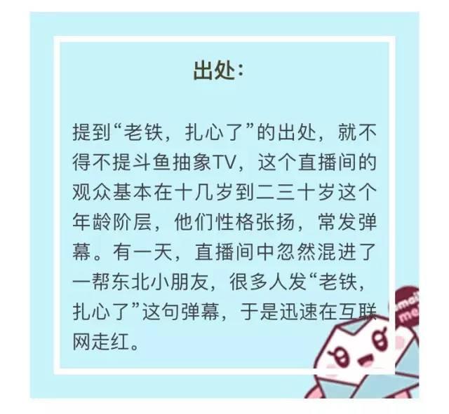 这句流行语的最原始形态是“老铁,扎心了”,是一句东北话。“老铁”是北方方言“铁哥们”的意思,“扎心”是指内心受到了极大的摧残和刺激。