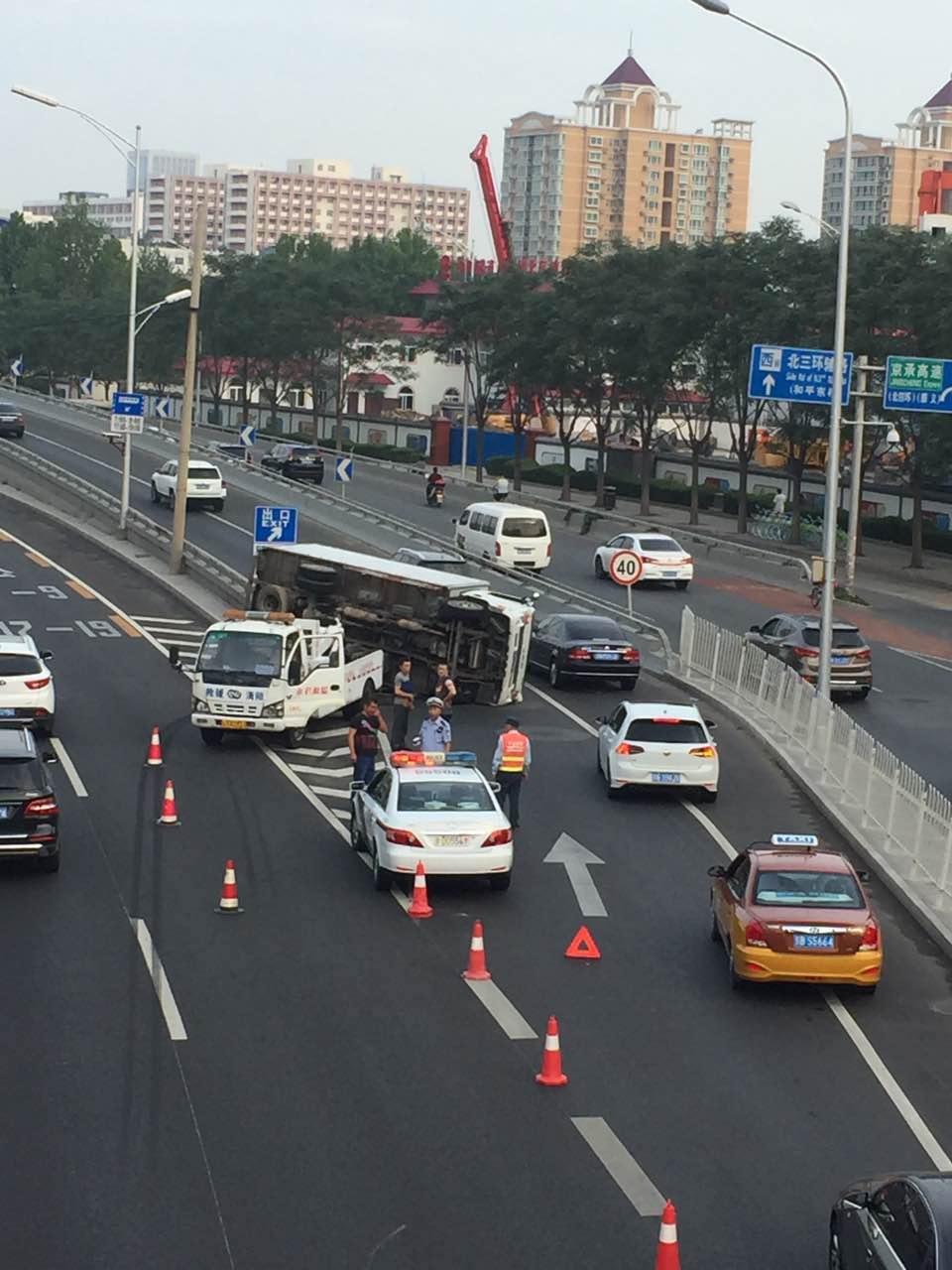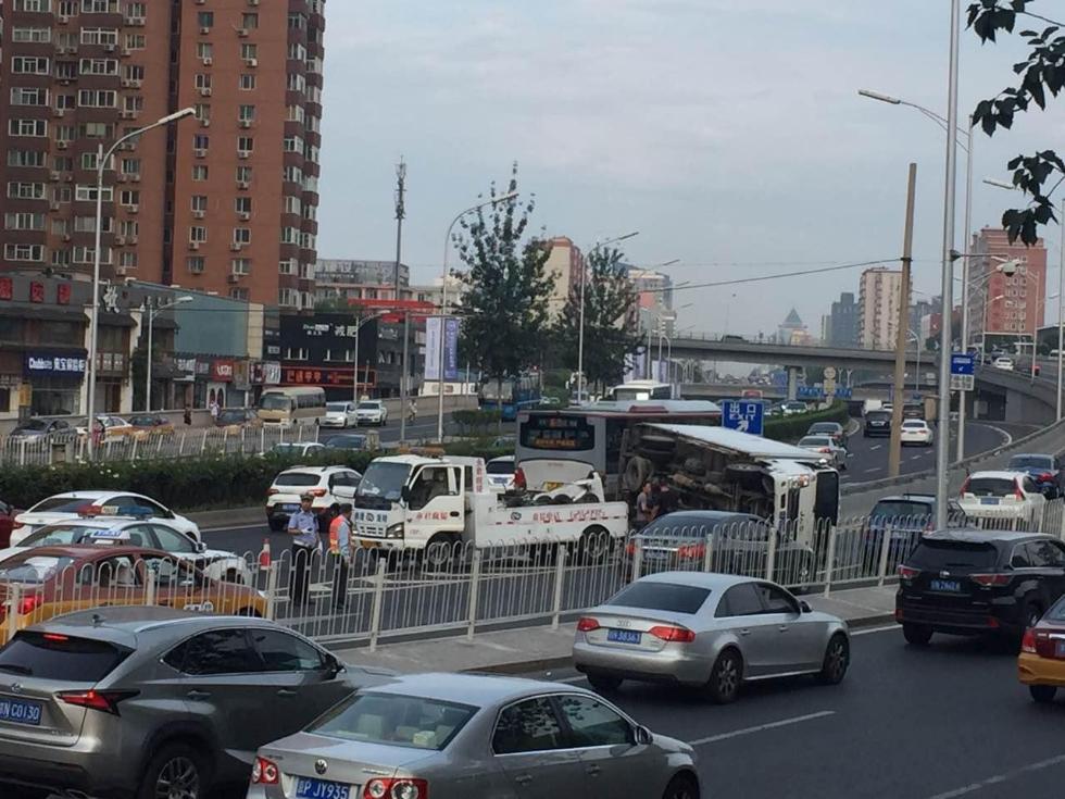 北三环京承高速入口一货车侧翻 拥堵近2公里