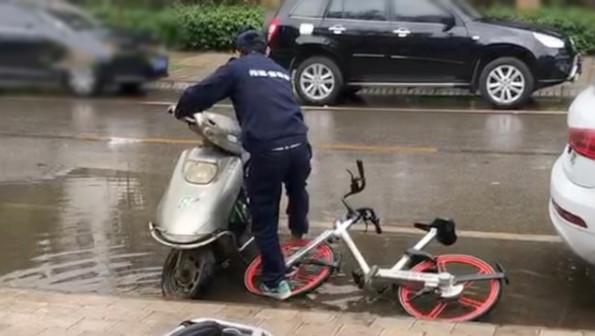 近日 云南昆明一人行道边,一名男子准备骑自己停路边的电动车。因下雨路面积水,男子担心湿了鞋,直接把人行道上的一辆共享单车丢水里垫脚。