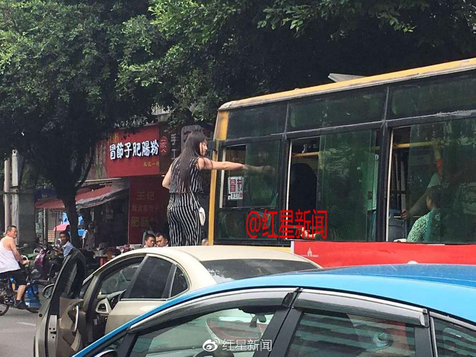 一句脏话惹怒女司机 站在引擎盖上对骂后翻进公交车