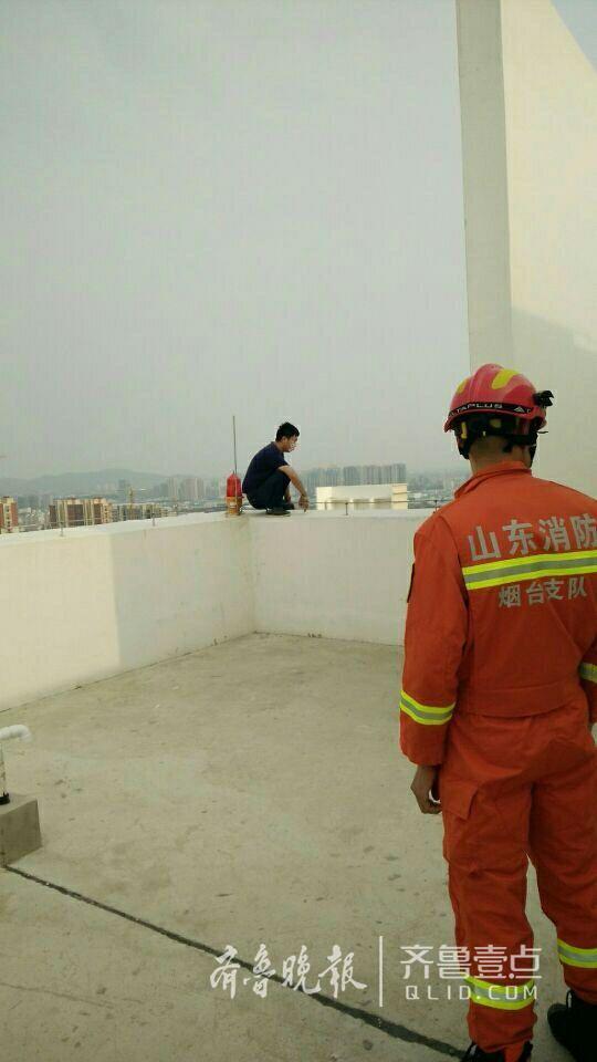 到达现场后消防官兵发现一名约30岁的男子蹲在楼顶的平台边缘,欲跳楼轻生。