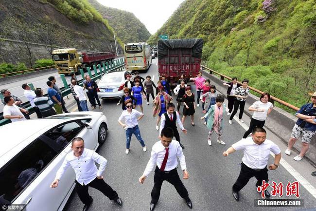 【高速公路】2017年4月22日10时多,西安,在西汉高速户菜出口东边,遭遇小范围的堵车,近百辆大小不一车辆滞留等待长约半个多小时,一群乘客为驱散堵车心慌、心烦,跳起舞蹈解闷。