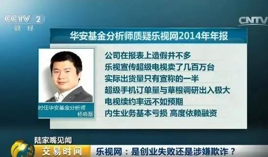 2015年6月,华安基金分析师杨晓磊公开质疑乐视2014你年报,他认为公司在报表上的造假并不多,但据测算,乐视宣传超级电视卖了几百万台,但实际出货量只有宣称的一半、超级手机订单量也与草根调研数据出入极大,电视续约率远不如预期,内生业务基本亏损,高度依赖融资。