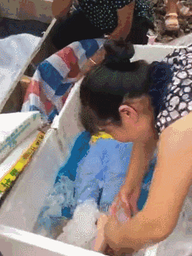 视频的内容也是非常的揪心,一个四五岁大小的小男孩直挺挺地躺着在一个大泡沫箱里,身体周围有大块、大块的冰块,一个中年妇女一边恸哭一边往外捡拾冰块,旁边也传来撕心裂肺的哭声。