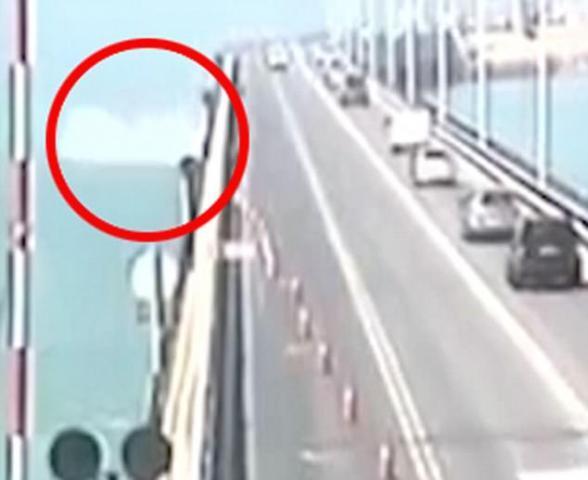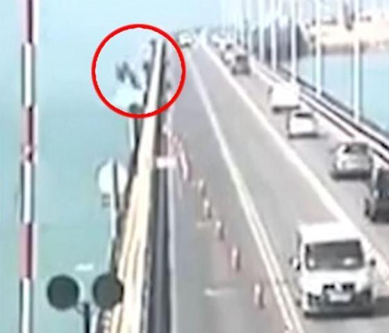 在自己的拖车无法及时减速的情况下,为了避免二次碰撞,这位司机决定急打方向盘,向右避让。但是令他没想到的是,拖车由此失控,在撞破大桥栏杆之后脱离桥面,整个车身坠落到海中。交通监控摄像头拍下了拖车坠海的整个过程,目击者称这一幕像"电影中的场景"。