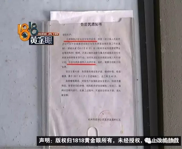 在房间门口的楼道墙上,我们看到一张告居民通知书,为保障群众住宅房屋使用安全,将对房屋进行改造,于5月3日进行施工,工期40天,告示是杭州市西湖区西溪街道溪畔社区张贴的。朱先生表示,他之前来看房时,根本没注意到。