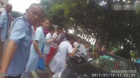 执法记录仪视频记录下了砸窗救人的一幕,民警尹宇峰用手电筒砸碎车窗,救出被锁车内热昏过去的小女孩。
