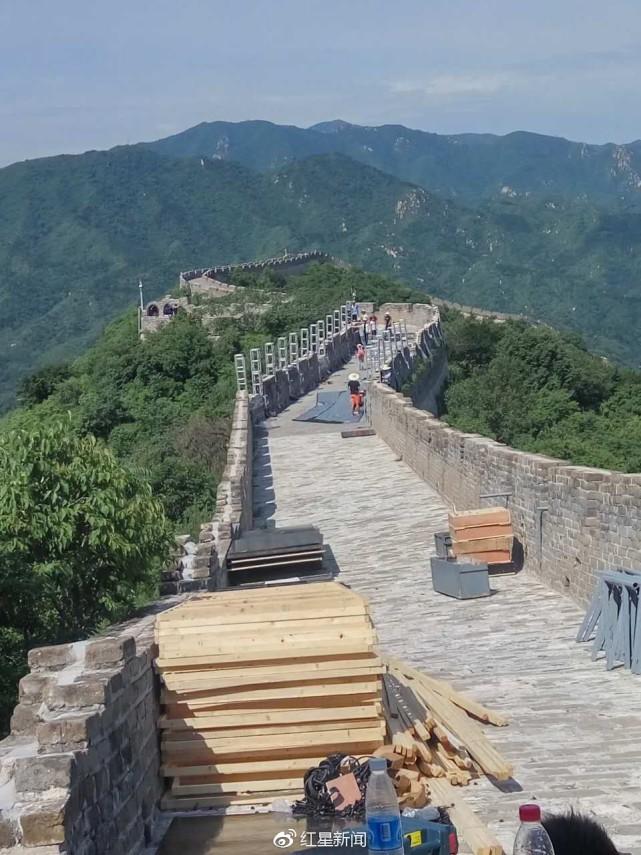 公司连续两天安排他们搬运器材到长城上,为一个国际内衣秀搭建舞台。受访者供图