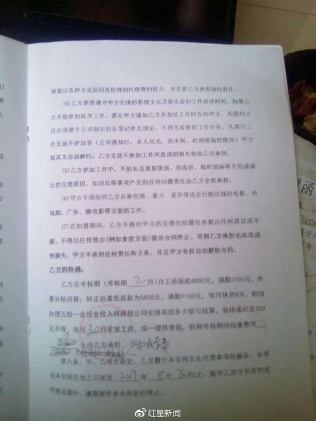 陈璐提供的合同显示,公司拟让受骗者在其摄制的电影或电视剧中担任演员。在考核期,月工资保底4800元,满勤1100元,补贴另算,转正后最低底薪为5800元,满勤1100元,每月休息8天,剧组办理五险一金。每月30日发工资,统一提供食宿,前期考核期间伙食费由乙方承担。合同最后备注,“乙方所缴纳伙食费在试用期后给予报销,合同期内自动放弃或退出者,所有费用均不退还”。