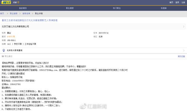 红星新闻记者根据登记信息致电北京艾瑞儿文化传媒有限公司,对方称公司没有发布过任何招聘艺人助理、导演助理、群众演员的招聘信息。之后他给记者回电话表示公司已经报警,会对侵害公司名誉的行为追责。