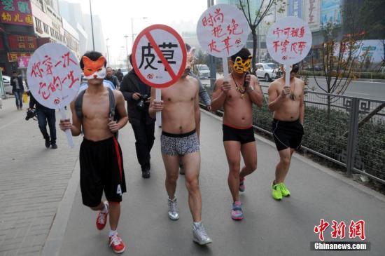 资料图:山西太原志愿者手持抗议穿着皮草的标语,裸身在商业街行走,呼吁保护动物,抗议皮草交易。中新社发 武俊杰 摄