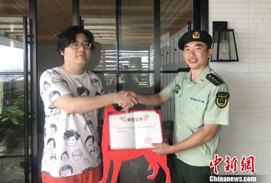 特勤中队副队长郭扬给肖先生送上捐赠书。 苟盼 摄