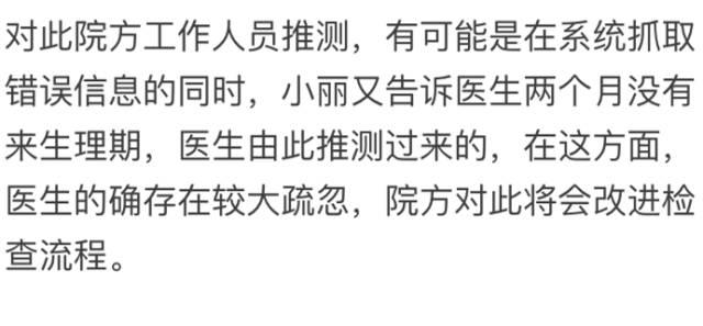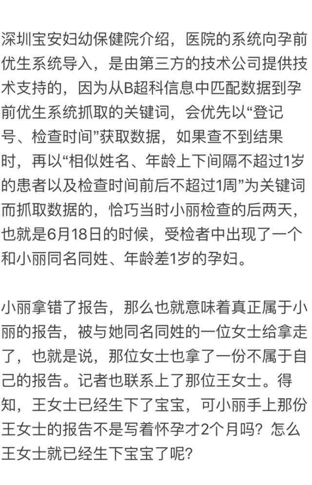 那么,明明是完璧之身,又怎么会检查出了身孕,带着疑问,记者陪同小丽去到了深圳宝安妇幼保健院,调查之后,医院才搞清楚,说是因为人名重合,两份报告张冠李戴了。因为孕前优生系统,与医院相关系统之间,在数据传输和匹配的过程中,出现了差错。