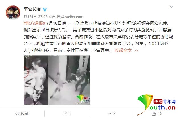 7月21日晚23时,山西省长治市公安局官方微博针对此事发布警情通报,称民警接到报案后,经过视频追踪、合成作战,在太原市尖草坪公安分局等单位的协助配合下,将逃往太原市的重大抢劫案犯罪嫌疑人司某某(男,24岁,长治市郊区人)抓捕归案。目前,案件正在进一步审理中。