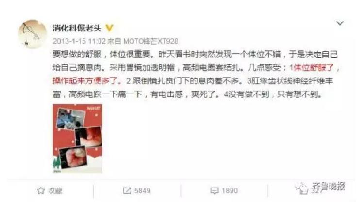 2013年1月,苏州大学附属第一医院消化科的刘医生(微博@消化科倔老头)推送了一则自己给自己摘息肉的微博,引起热议。
