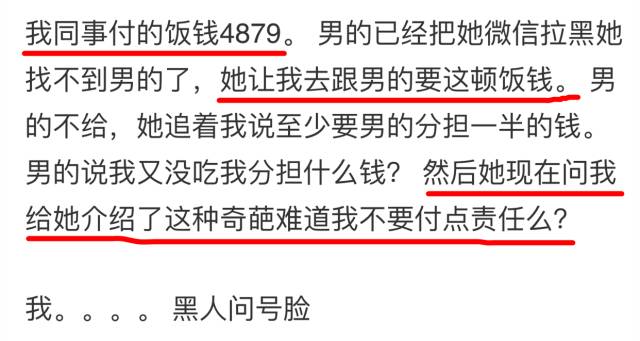 我给同事介绍了一个男的,男的请同事吃饭没买单跑路了,同事跟我要饭钱。
