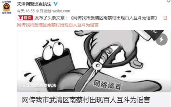 针对此信息我市公安机关立即开展查证工作。经核实,实际情况为2017年7月23日夜,武清区南蔡村镇发生打架事件,致杨某、姜某等几人受伤,伤情均为软组织损伤、皮外伤。网上谣传南蔡村出现百人互斗,死伤无数,或死五伤八均属谣言。目前网安部门已会同属地分局正在积极开展进一步工作。