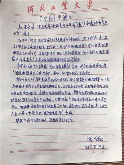 崔全政为父亲递交的见义勇为申请书