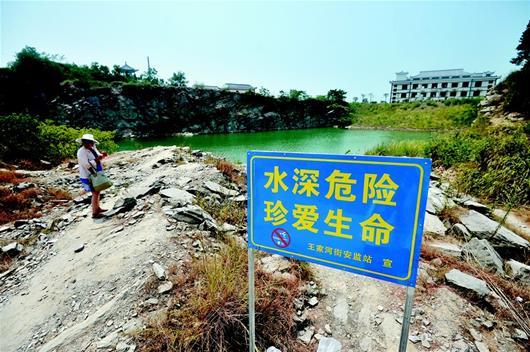楚天都市报讯 图为:积水的采石坑旁立有警示牌