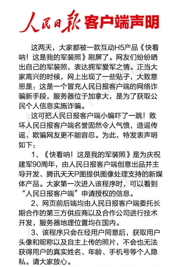 人民日报:“快看呐!这是我的军装照”不是网络诈骗