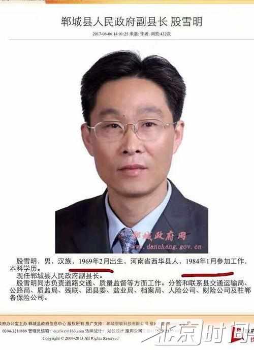 北京时间检索媒体公开资料发现,殷雪明今年6月任职郸城县副县长前,是周口市淮阳县副县长,分管科技局、科协、民政局、残联、工商局等11家单位。