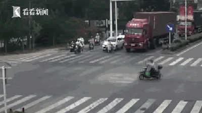 从事故发生的监控画面以看到:当时大货车正在等待红灯,当绿灯亮起时,大货车起步,就在这个时候,一辆电动车从大货车面前左转弯过马路,两车相撞。电动车驾驶人在被撞倒地的瞬间,就地翻滚,捡回了一条命。