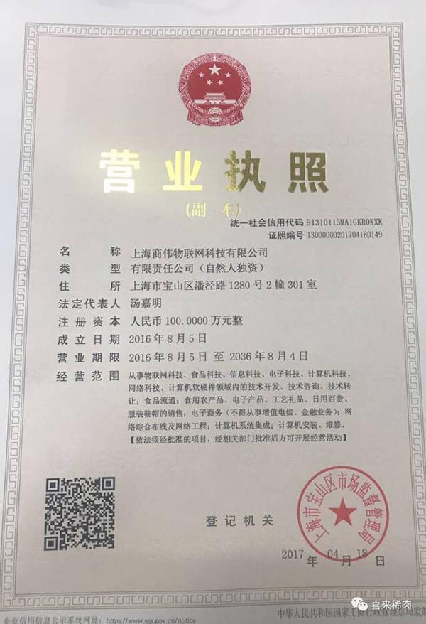 8月3日,该公司再次发表媒体声明,此事,喜来稀肉已经上报政府相关部门介入调查,并通过法律途径追究发布及传播该不实消息的相关组织及个人。声明中称:喜来稀肉证照齐全,都是通过符合食品安全标准进过生产销售的。