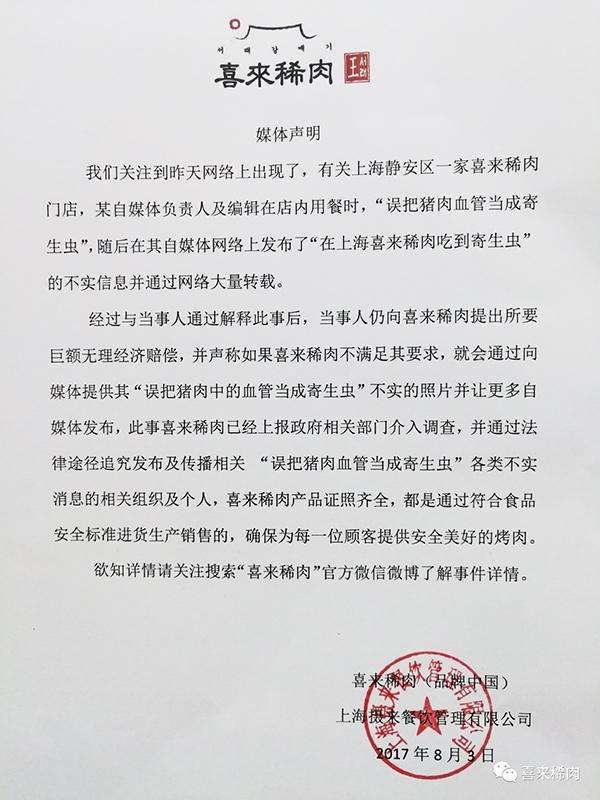 同一天,公众号“喜来稀肉”发表文章《别让网络暴力毁掉又一个品牌!》称,文章说到的不明物体来自门店辣五花肉,但并不是寄生虫,而是猪血管。并提供该公司的肉类检疫报告,落款日期为7月28日。贴出的图片显示,该公司肉品是来自双汇集团的冷鲜肉。