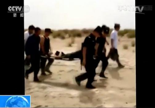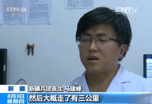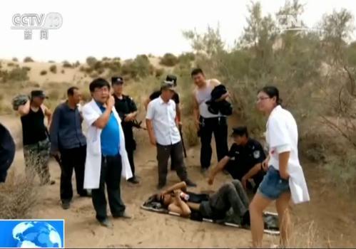 新疆兵团医生 马建峰:步行一直走到去寻找他,就按照定位去找,找这个人。然后大概走了有三公里天气很热而且我们扛着氧气筒又抬着担架脚陷在沙子里。现在外面温度都很高,沙漠里的沙子都特别烫脚,而且也没有路,到处都是荆棘什么的反正也不好走。