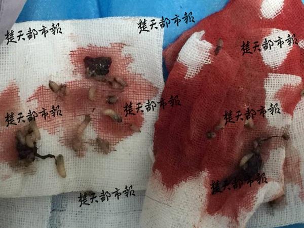 8月8日讯7日上午,在长江航运总医院手术室,神经外科医生从75岁的周老后脑勺腐烂处取出了50余条蛆虫。这惊心的一幕,竟是三天前老人抠破头上的“包”所致。