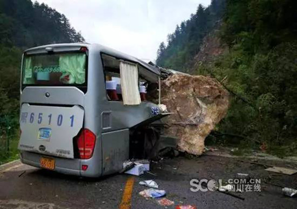 但一切都来不及反应。不到一分钟,一声巨响,一块巨石砸向大巴车顶。事后流传出的照片显示,川R65101旅游大巴前半车身被巨石砸中,严重变形。