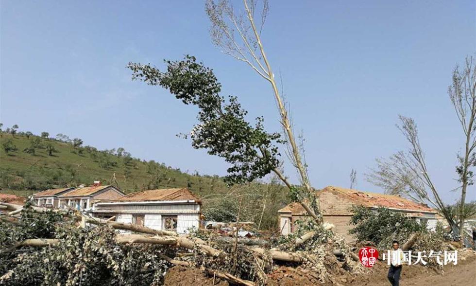 图为8月11日,赤峰市克什克腾旗五台山村的树木被龙卷风刮倒损毁。
