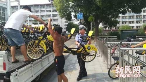 图说:松江警方对在辖区道路投放的双人共享单车集中清理。松江警方 供图