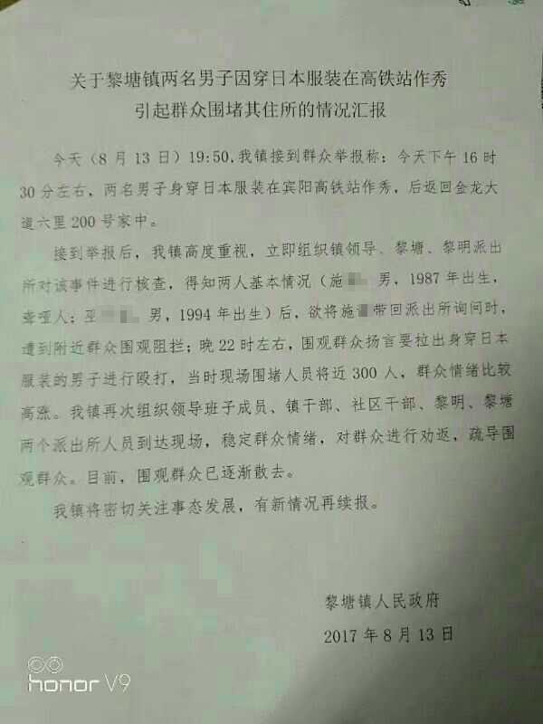 8月13日,宾阳县黎塘镇政府发布通告称,当天19时50分,接到举报称,两男子身穿日本服装在宾阳高铁站作秀,黎塘、黎明镇派出所对该事进行核查,得知两人基本情况(施谦,男,1987年出生,聋哑人;巫子富,男,1994年出生)后,欲将施谦带回派出所进行询问时,遭到围观群众阻拦,并扬言要拉出去进行殴打,当时围堵群众将近300人,“群众情绪比较高涨”。