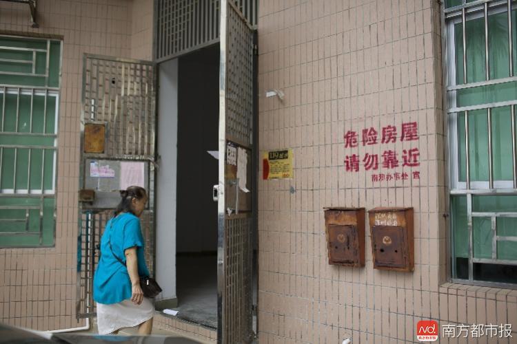 南都记者来到小区11栋,该栋建筑分A、B两单元,楼下的墙面上印有红色的“危险房屋 请勿靠近”大字,而两单元中间则立着一面一般政府办公场所都会有的大玻璃门,玻璃门已经锁上,玻璃面上和门把手落满了灰尘。记者发现,居委会的牌子也已不在了,旁边只剩下空着的居委会的公开栏。