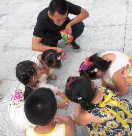 8月9日下午4点,活动开始。老师们将小班的孩子们集中在校门前广场上后躲了起来。和老师躲在一起的,是所有孩子的家长,大家可以观看到孩子们的表现,但是孩子看不到他们。刘铖宇和另外一名民警作为警戒力量守护现场,另外两名男警和两名女警,身穿便装开始“行骗”……